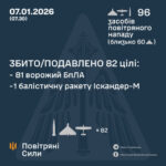 У ніч проти 7 січня Росія влаштувала нову повітряну атаку на Україну: ворог застосував 96 засобів повітряного нападу: одну балістичну ракету і 95 ударних безпілотників. Сили ППО знешкодили 82 цілі, зокрема й “Іскандер-М”.